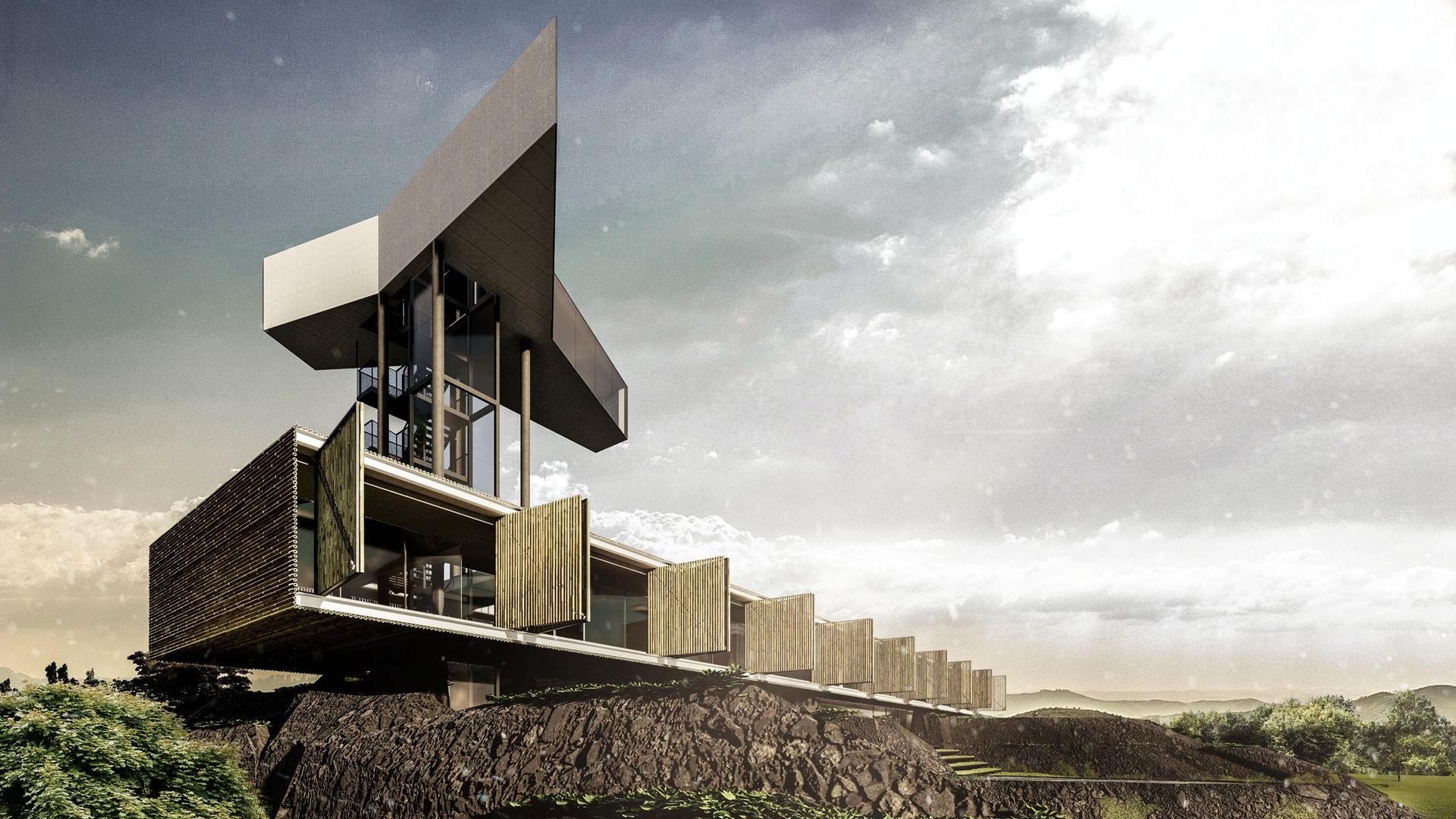 The India House, located on the banks of Lingambudhi Lake, consists of three main elements. A horizontal pavilion, volcanic stone walls that emerge from the ground, and a 17 meters high tower where the library and the spa reach the spectacular view of the surrounding landscape.