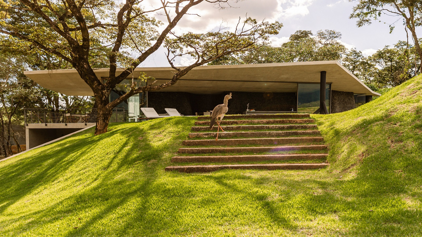 In the Seriema House, a winding wall divides two opposite spaces; the sun and the shade, mountain and groove, social and intimate, gaping and hidden, explicit and enigmatic.