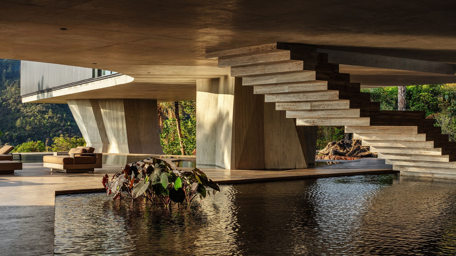 The Xingu House is set in a huge and complex land, with remaining stone walls from an old building, native forests, grassy plateaus, and spectacular views of the mountains. There is even a cave, where the winery and cheesemaking will be. The shape of the house is an answer to all these peculiarities. The back embraces the jungle, while the front hangs towards the view over water mirrors.